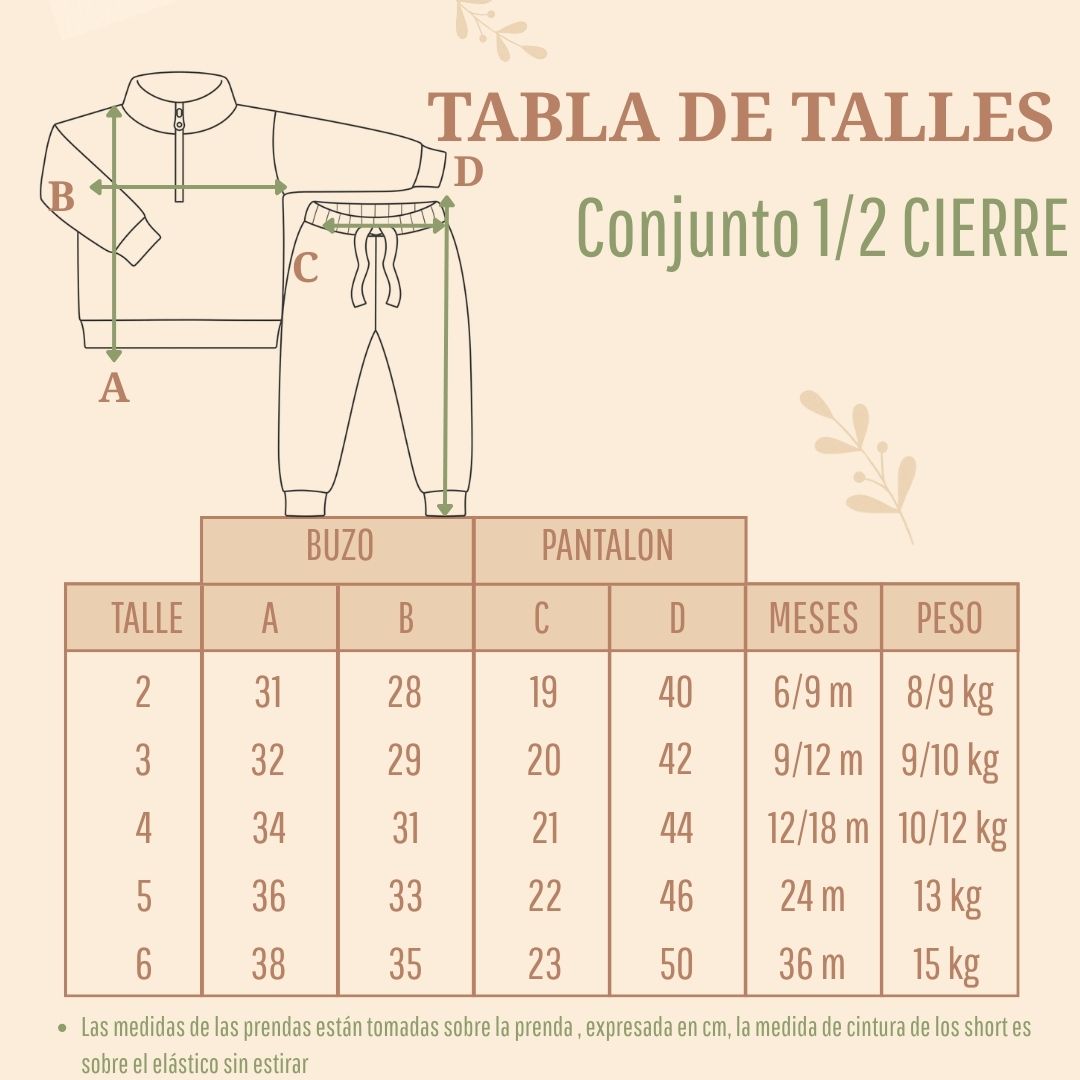Este conjunto incluye un buzo con medio cierre para vestir con mayor facilidad y un pantalón con cintura elástica que se ajusta suavemente al cuerpo del bebé. Ideal para climas frescos, paseos y momentos de juego.